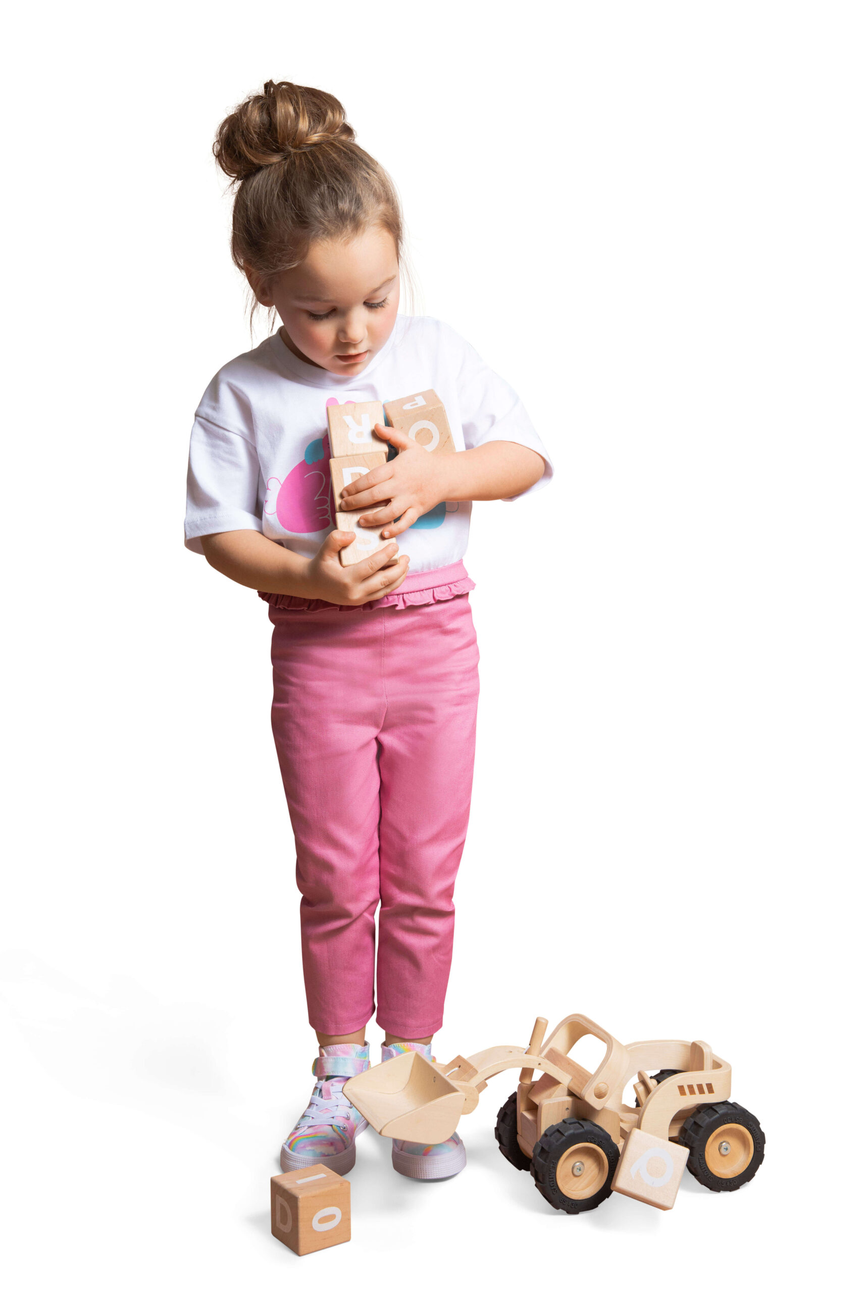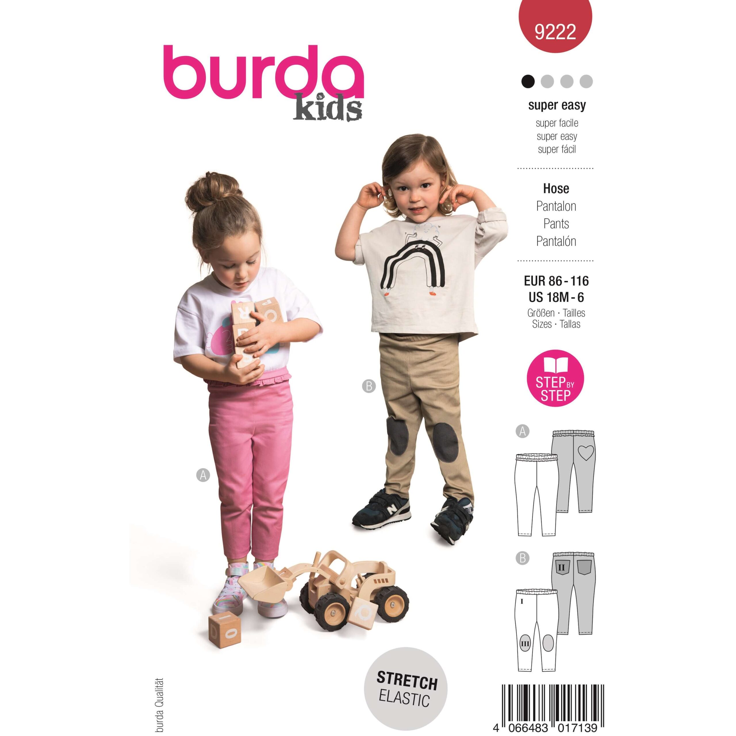 Bukse til barn med variasjoner i lommene og pynt. Kun for strikkede stoffer.