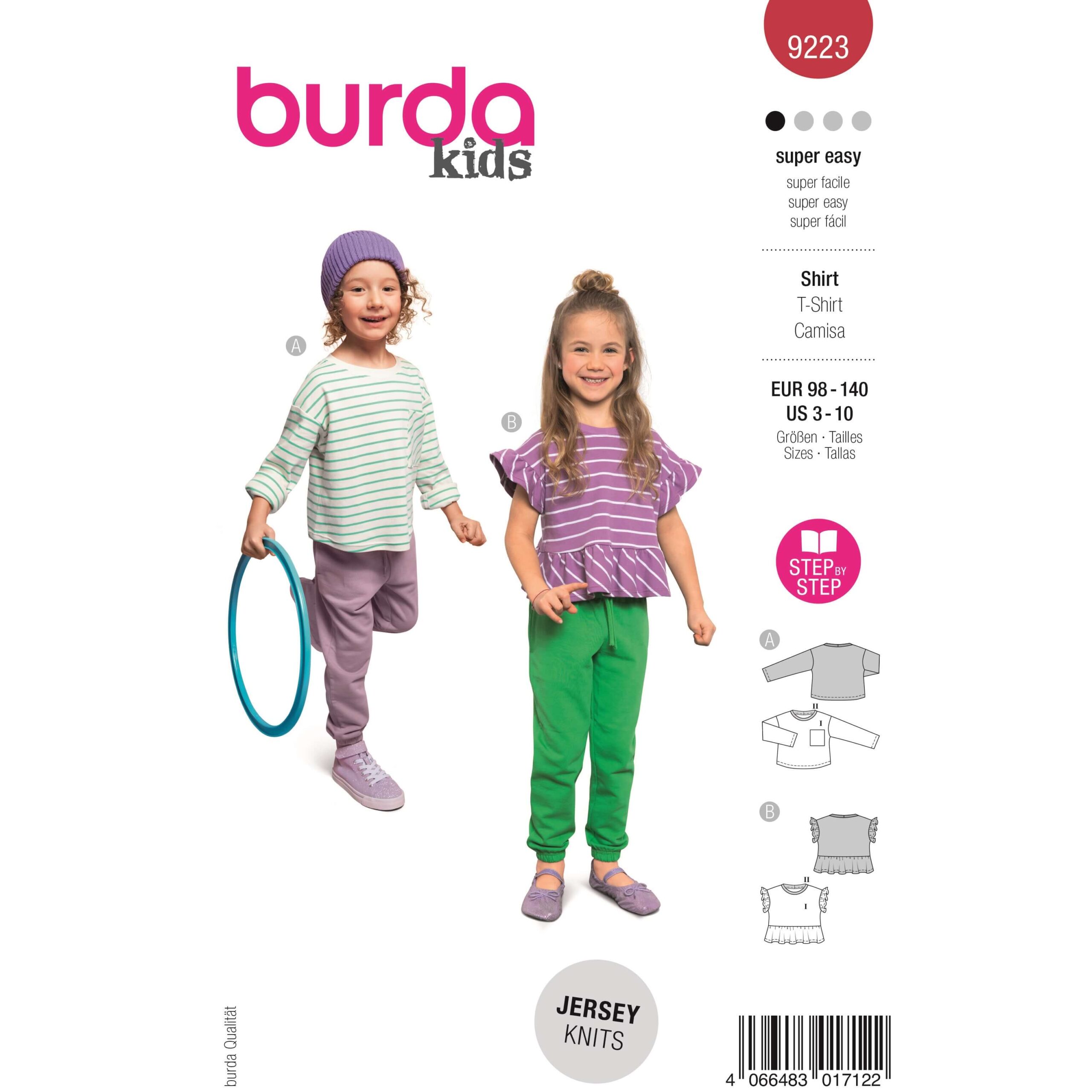 T-skjorte til barn med korte eller lange ermer og med/uten rysje på nederkanten. Kun for strikkede stoffer.